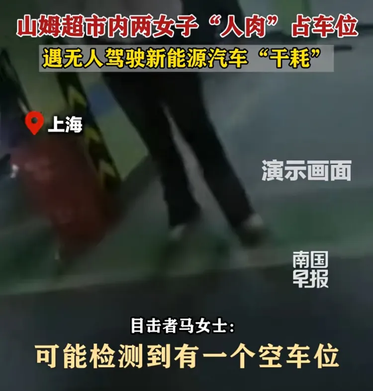 2月1日,目击者马女士称,两名女子站在空车位上占位,当时车位紧张,新能源汽车进入停车场后,车主开启自动泊车就下车了。